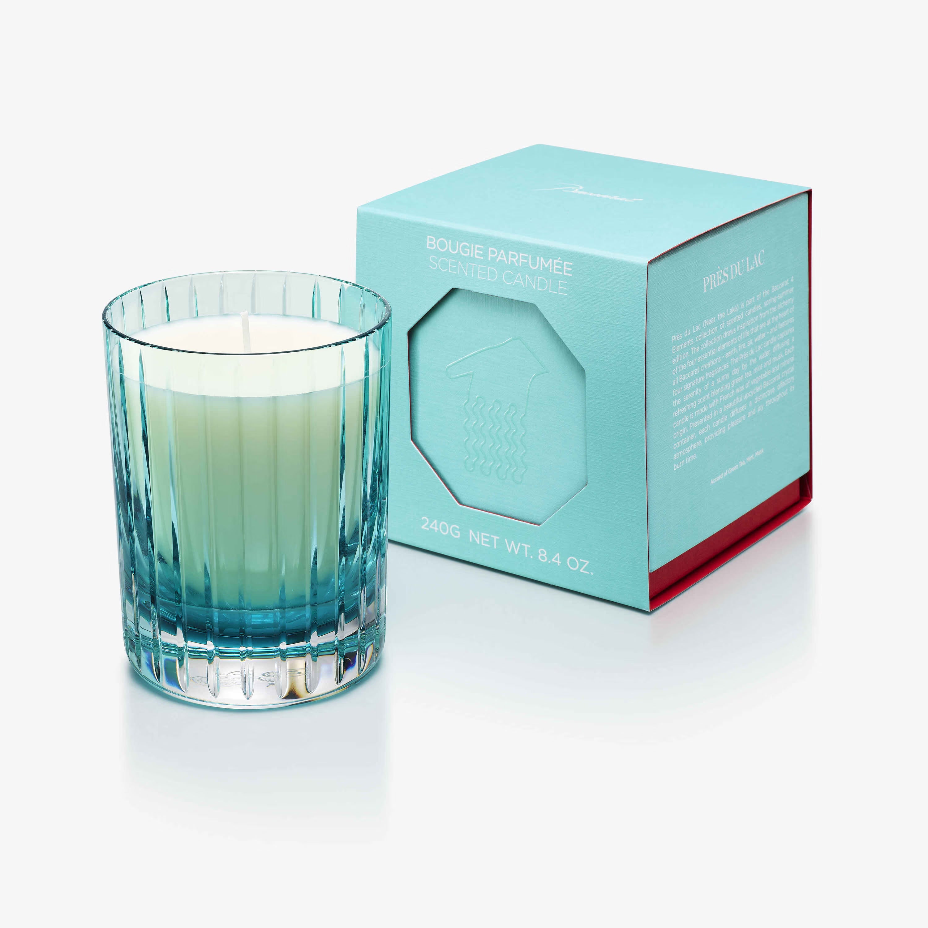 Eau Infinie (Acqua infinita) appartiene alla collezione di candele profumate Baccarat ispirata ai quattro elementi. Questa collezione presenta quattro fragranze d'autore, ognuna delle quali cattura l'essenza unica di terra, acqua, aria e fuoco. La candela Eau Infinie, in una creazione di cristallo verde, cattura l'energia vitale dell'acqua che nutre la natura e dispiega un profumo rinfrescante ed erbaceo composto da note di galbano, muschio e terra bagnata. Ogni candela è realizzata con cera francese di origine vegetale e minerale. La collezione di candele profumate Baccarat Four Elements trae ispirazione dall'alchimia dei quattro elementi essenziali della vita che sono alla base di tutte le creazioni Baccarat. Presentata in uno splendido contenitore di cristallo Baccarat, ogni candela diffonde un'atmosfera olfattiva distintiva, regalando piacere e gioia per tutto il tempo di combustione.