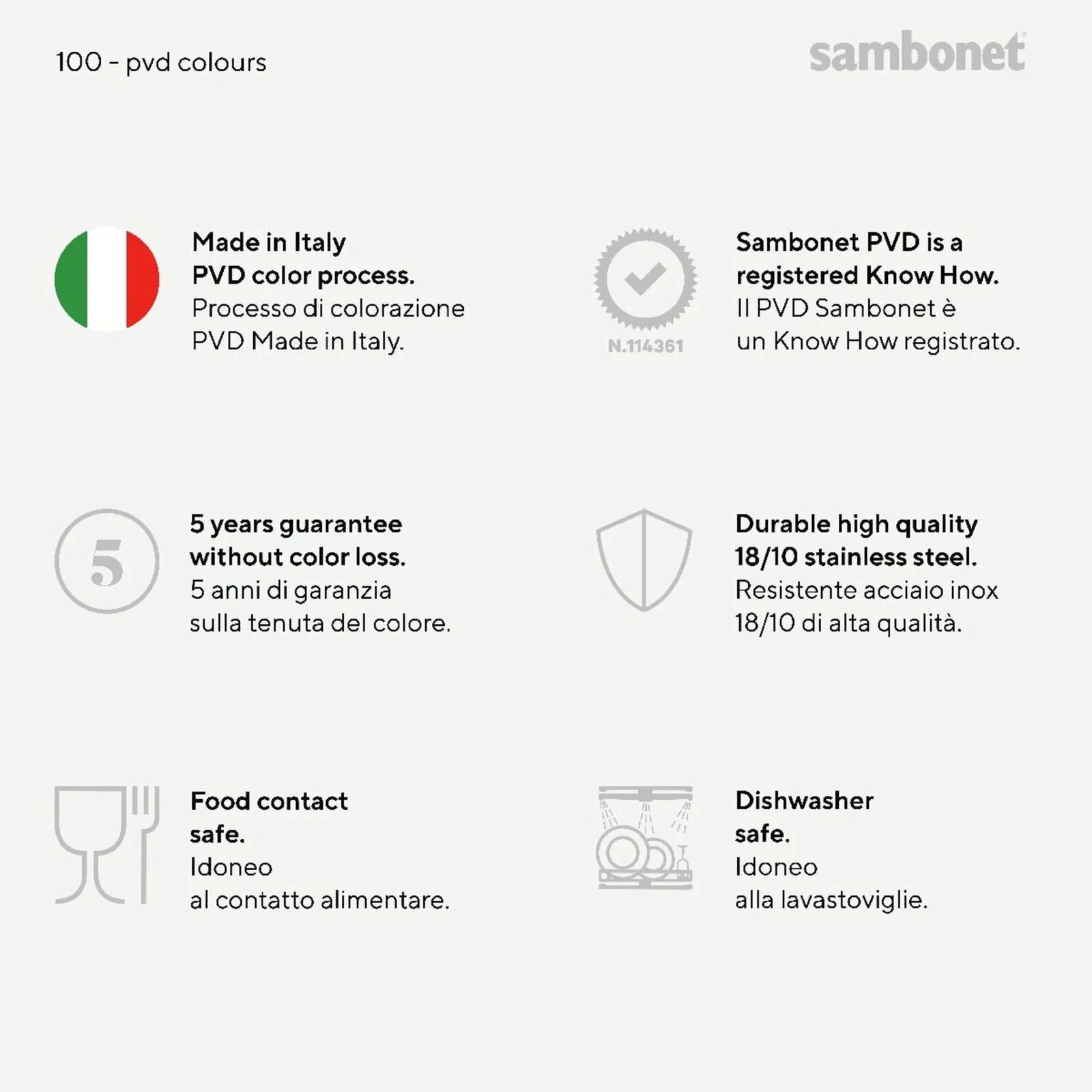 PVD - PULIZIA: Per la pulizia quotidiana, lavare a mano in lavastoviglie con detersivo liquido, nonaggressivo, a massima diluizione. LAVAGGIO: Per il lavaggio a mano, risciacquare sempreabbondantemente; asciugare bene conun panno pulito e morbido. Per il lavaggioin lavastoviglie, in mancanza di un ciclodi risciacquo e asciugatura completo,provvedere manualmente. Si sconsigliadi lasciare gli articoli all’interno dellalavastoviglie al termine del ciclo di lavaggio. Per tutte le attività di pulizia e manutenzione utilizzare unicamente panni morbidi. Nonutilizzare pagliette in acciaio, spugnetteabrasive o polveri abrasive, né barilatrici: illoro impiego potrebbe compromettere laqualità dello strato in PVD Per la rimozione di eventuali macchie oaloni (residui calcarei o prodotti di lavaggio) si suggerisce l’ammollo in acqua calda. Nelcaso di aloni particolarmente resistentisi consiglia l’aggiunta all’ammollo di unbicchiere d’aceto Evitare il contatto prolungato con prodottialimentari aggressivi, ad esempio residuidi pomodoro, maionese, uova, caffè, vinorosso, sale, aceto, ecc."